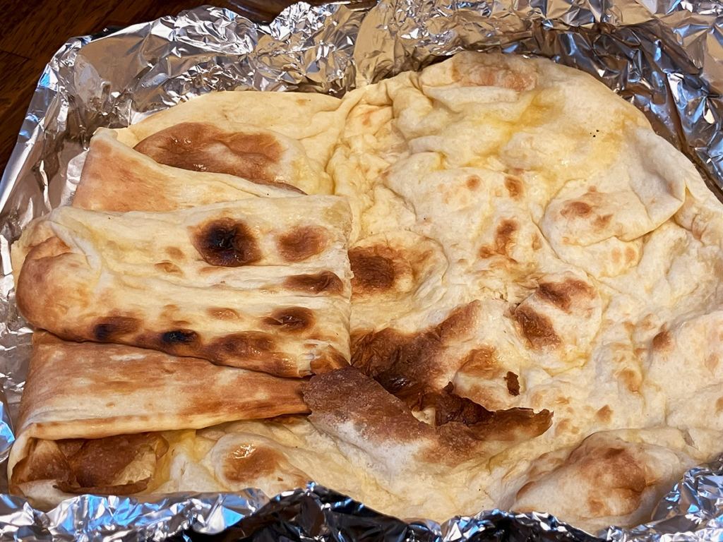 写真だと、折りたたまれているため判りにくいかもしれないですが、ナンはかなり大きめです。