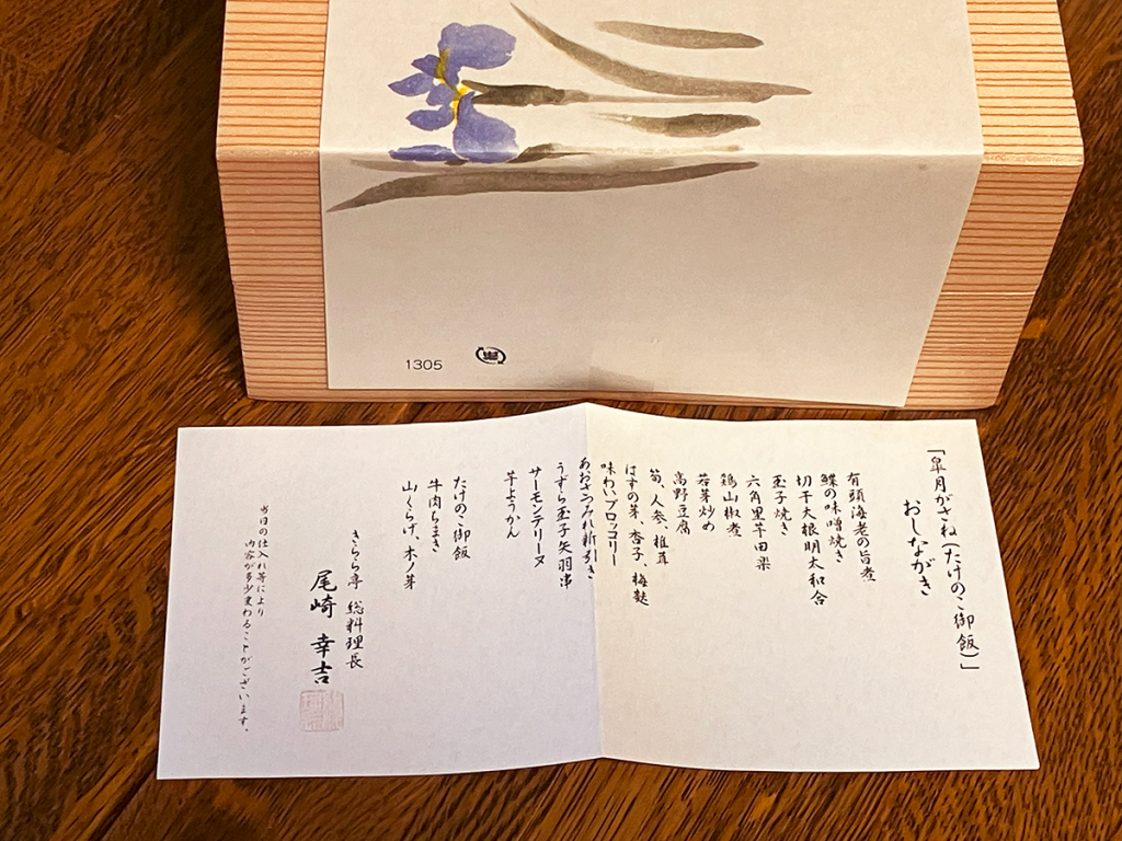 いわゆる幕の内系のお弁当ですが、「おしながき」が付いている点、おかずの種類がかなり豊富な点、二段重ねになっている点などが特長と言えます。